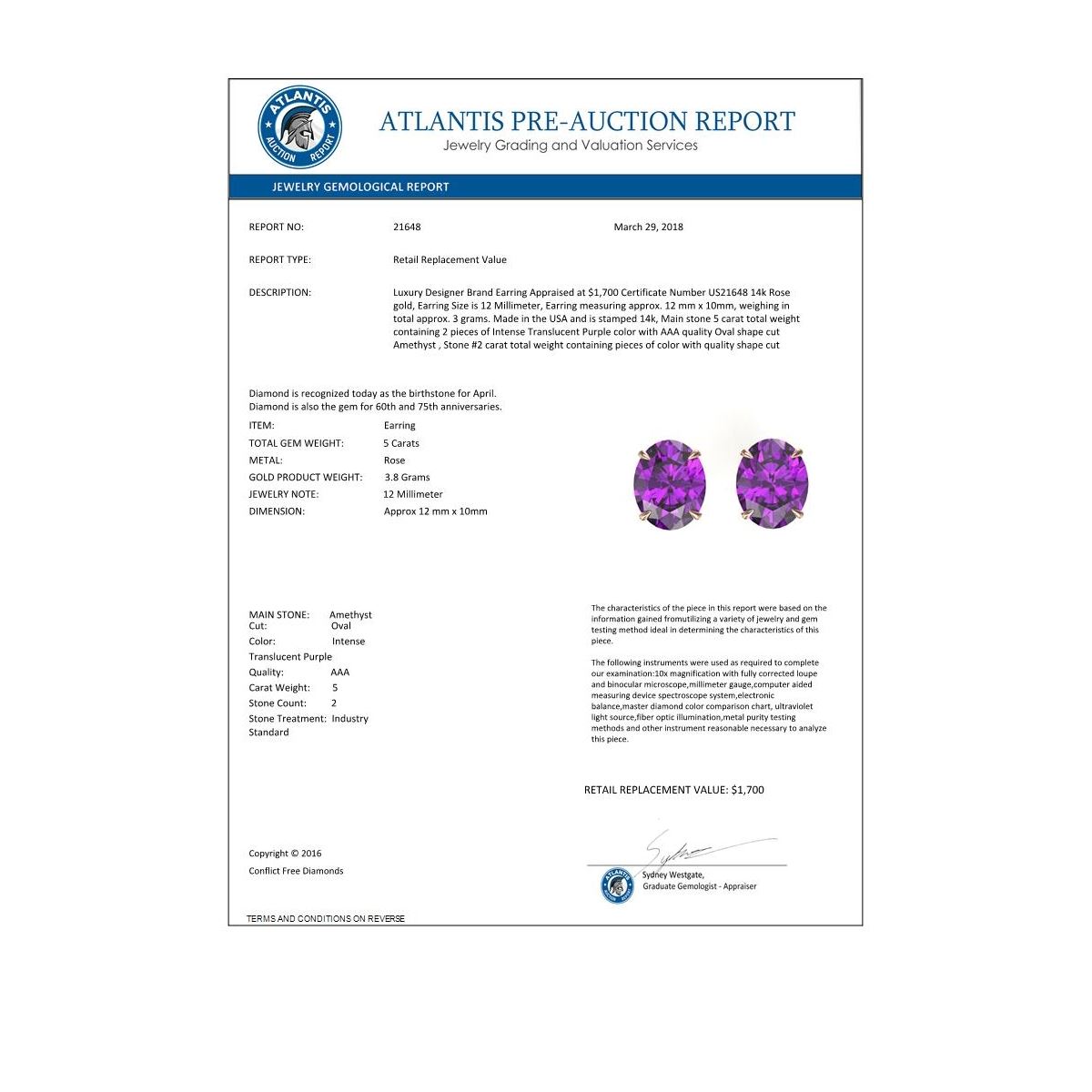 REF-25H8A -21648 ---- 5 CTW Amethyst Designer Inspired Solitaire Stud Earrings 14K Rose Gold ---- Luxury Designer Brand Earring Appraised at $1,700 Certificate Number US21648 14k Rose gold, Earring Size is 12 Millimeter, Earring measuring approx. 12 mm x 10mm, weighing in total approx. 3 grams. Made in the USA and is stamped 14k, Main stone 5 carat total weight containing 2 pieces of Intense Translucent Purple color with AAA quality Oval shape cut Amethyst , Stone #2 carat total weight containing pieces of color with quality shape cut