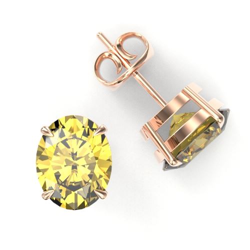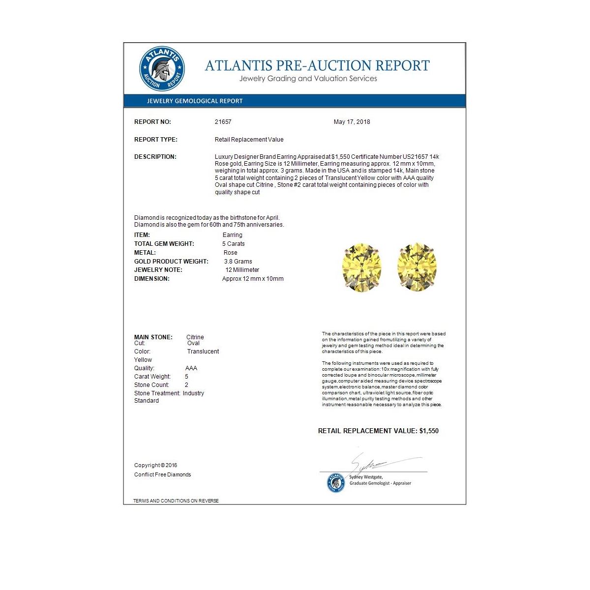 REF-25W8F -21657 ---- 5 CTW Citrine Designer Inspired Solitaire Stud Earrings 14K Rose Gold ---- Luxury Designer Brand Earring Appraised at $1,550 Certificate Number US21657 14k Rose gold, Earring Size is 12 Millimeter, Earring measuring approx. 12 mm x 10mm, weighing in total approx. 3 grams. Made in the USA and is stamped 14k, Main stone 5 carat total weight containing 2 pieces of Translucent Yellow color with AAA quality Oval shape cut Citrine , Stone #2 carat total weight containing pieces of color with quality shape cut