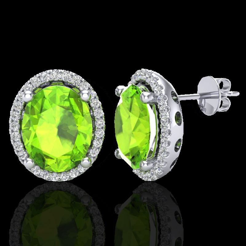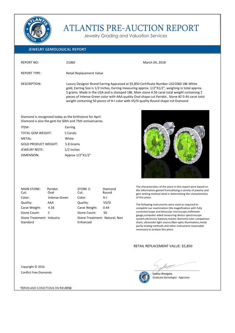 REF-82A2X -21060 ---- 5 CTW Peridot & Micro Pave VS/SI Diamond Earrings Halo 18K White Gold ---- Luxury Designer Brand Earring Appraised at $5,850 Certificate Number US21060 18k White gold, Earring Size is 1/2 Inches, Earring measuring approx. 1/2"X1/2", weighing in total approx. 5 grams. Made in the USA and is stamped 18k, Main stone 4.56 carat total weight containing 2 pieces of Intense Green color with AAA quality Oval shape cut Peridot , Stone #2 0.44 carat total weight containing 50 pieces of H-I color with VS/SI quality Round shape cut Diamond