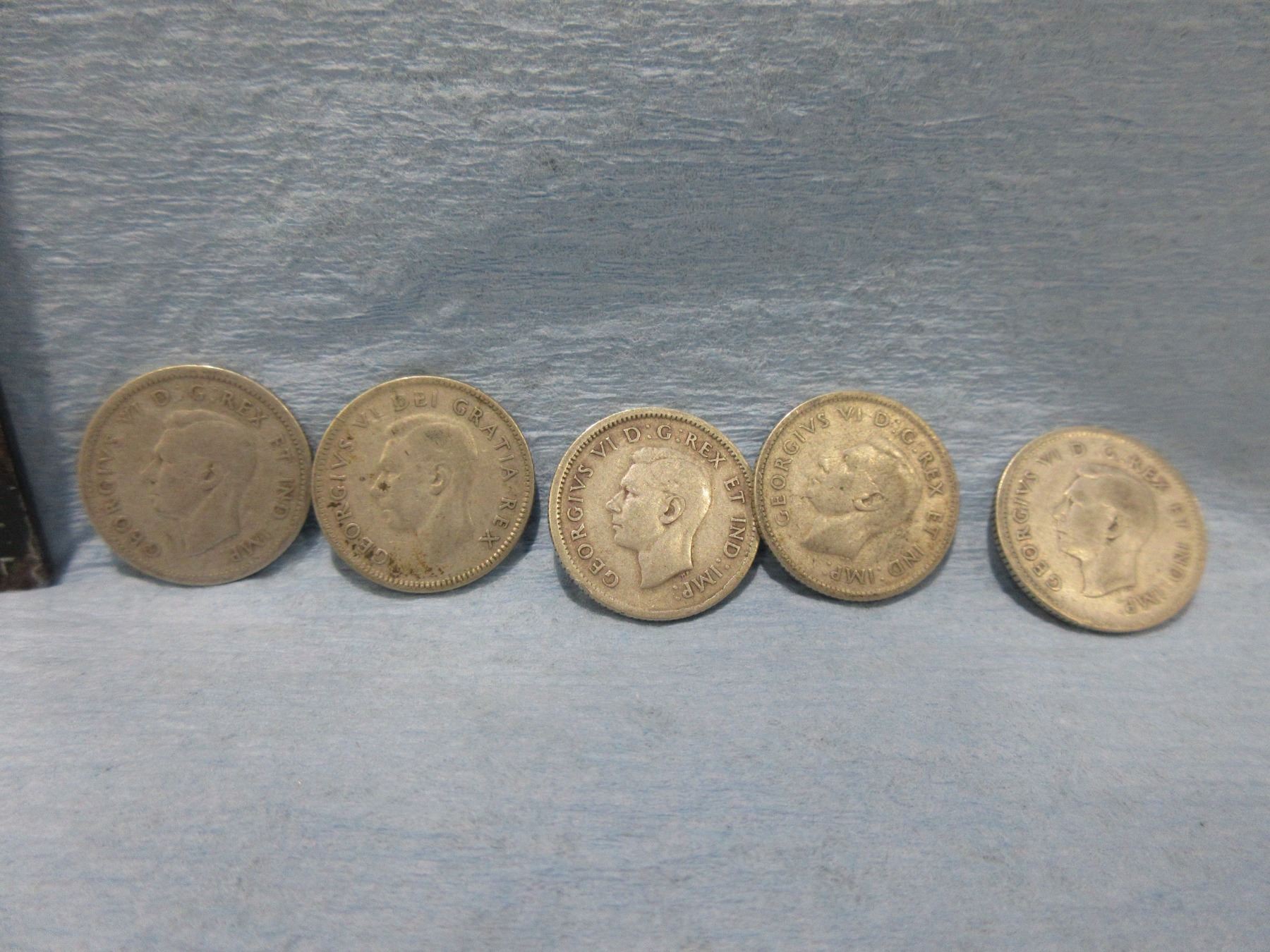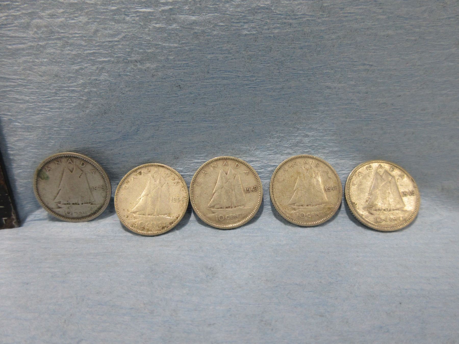 5 - Canadian 10 Cent Pieces - 1943 - 3, 1939 - 1, 1950 - 1, - 800 Silver