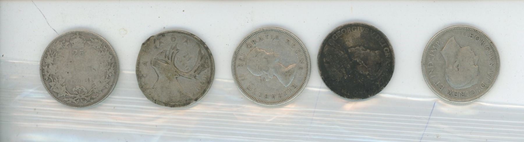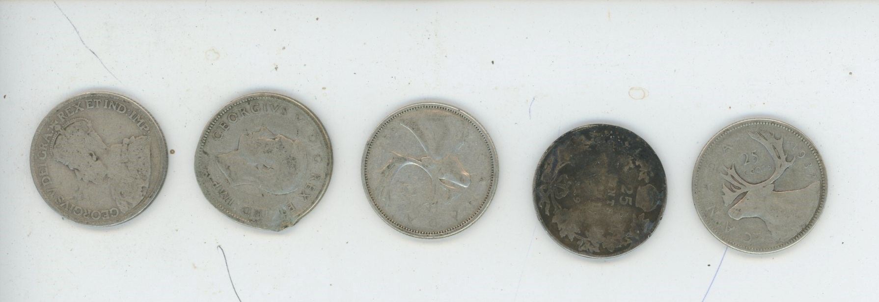 5 Canadian Quarters, 1913, 1937, 1937, 1919, and 1959