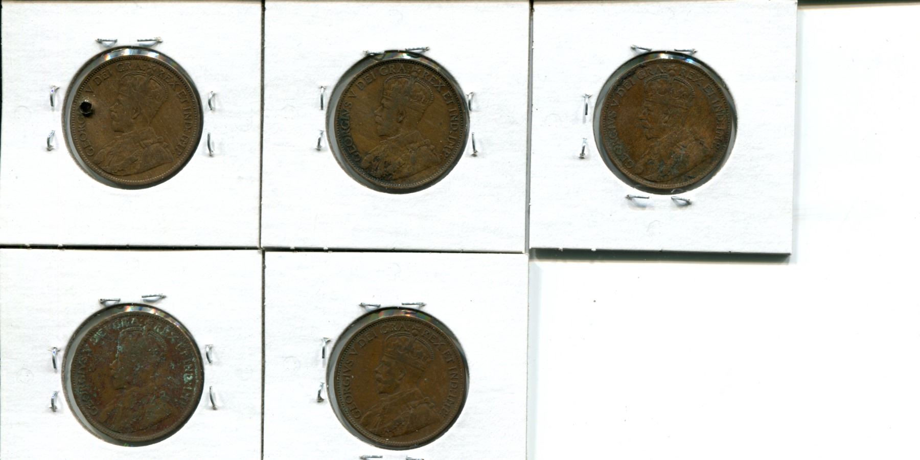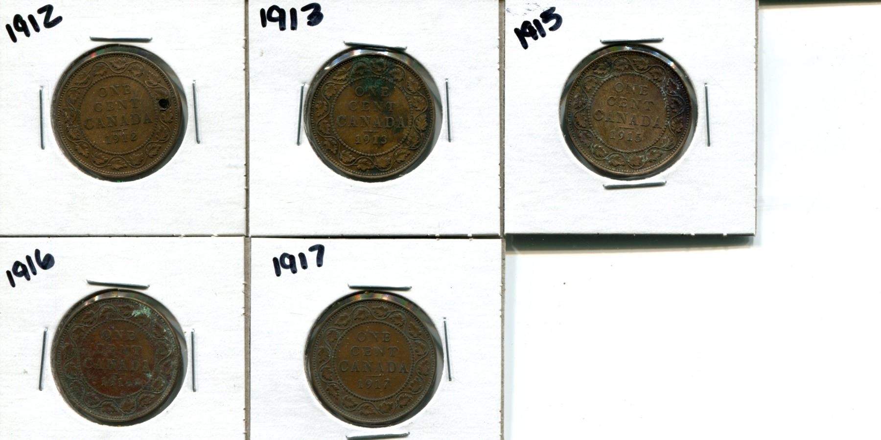 5 Canadian large cents 1912, 1913, 1915, 1916, 1917