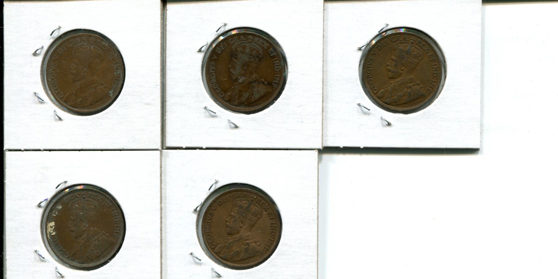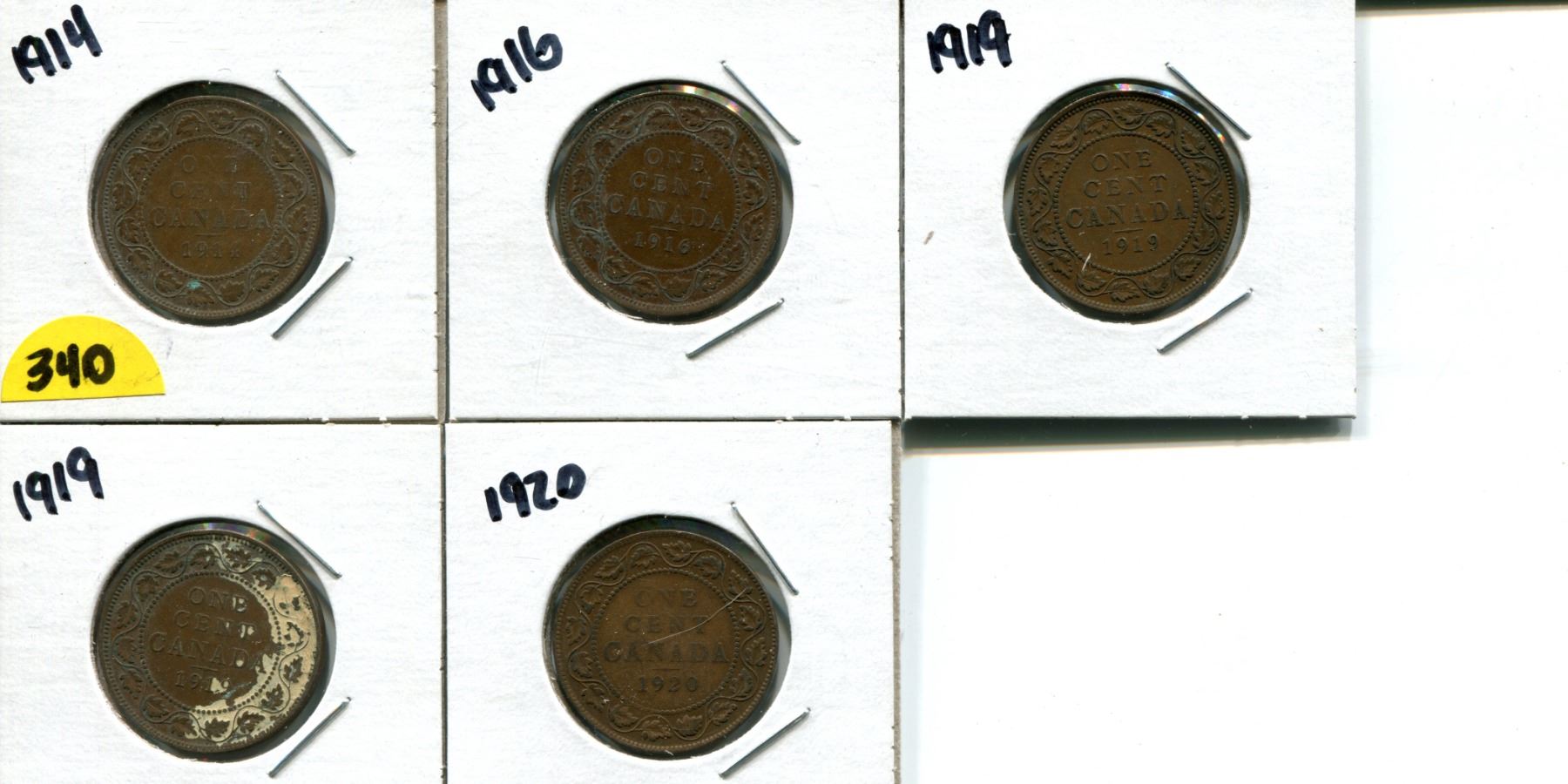 5 Canadian large cents 1914, 1916, 1919, 1919, 1920