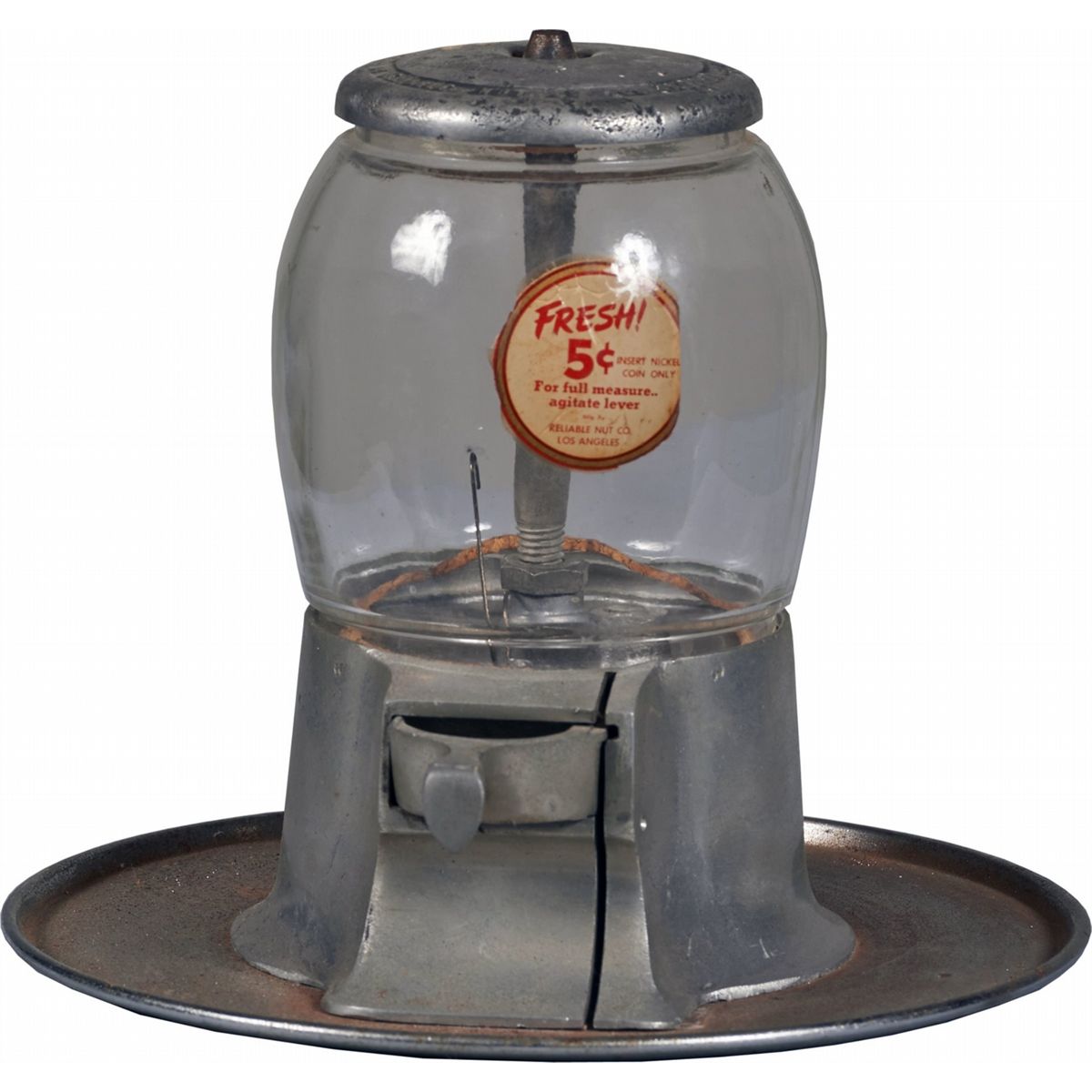 By Reliable Nut Co. Circa 1934. "Fresh 5 ¢ - For Full Measure...Agitate Lever" decal on globe. Condition (Very Good). Size 8" x 9-3/4".