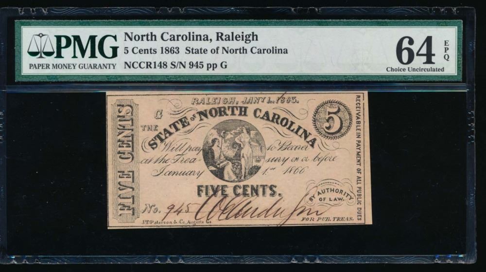 One 5 Cent 1863 North Carolina Obsolete Note PMG 64EPQ.