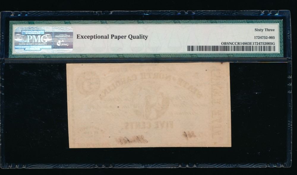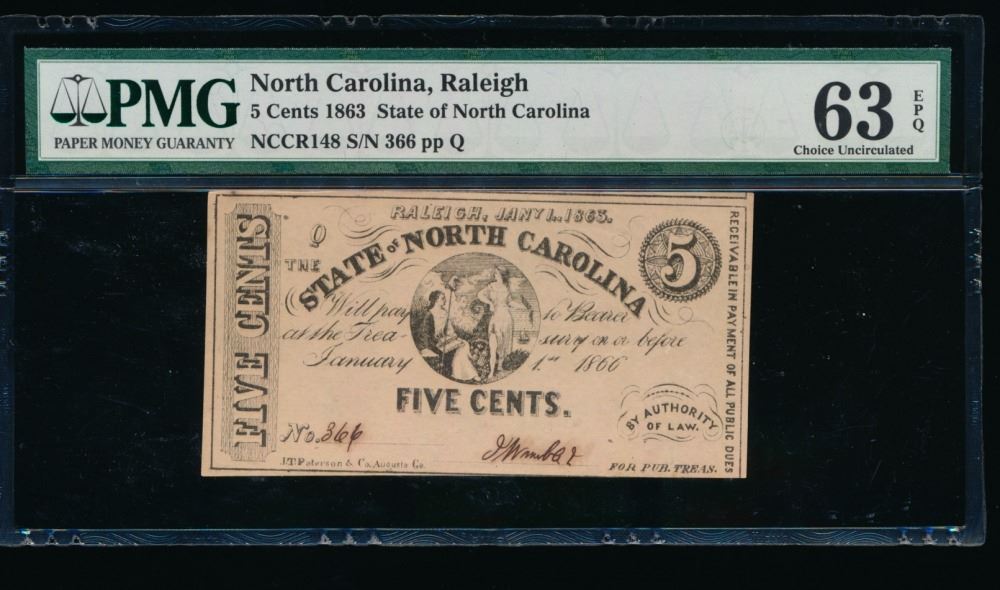 One 5 Cent 1863 Raleigh NC Obsolete Note PMG 63EPQ.