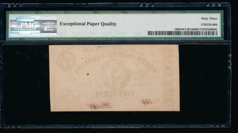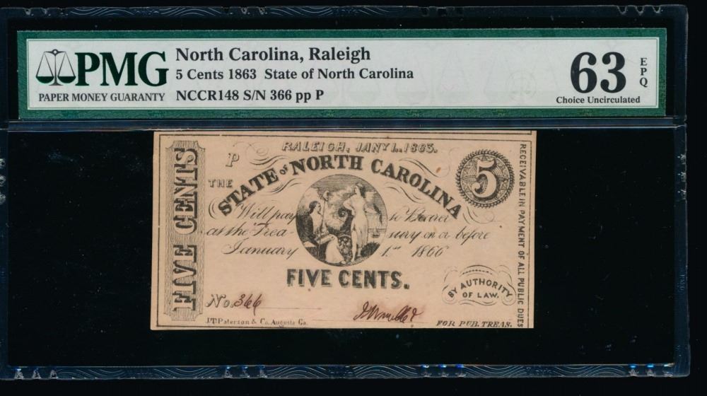 One 5 Cent 1863 Raleigh NC Obsolete Note PMG 63EPQ.