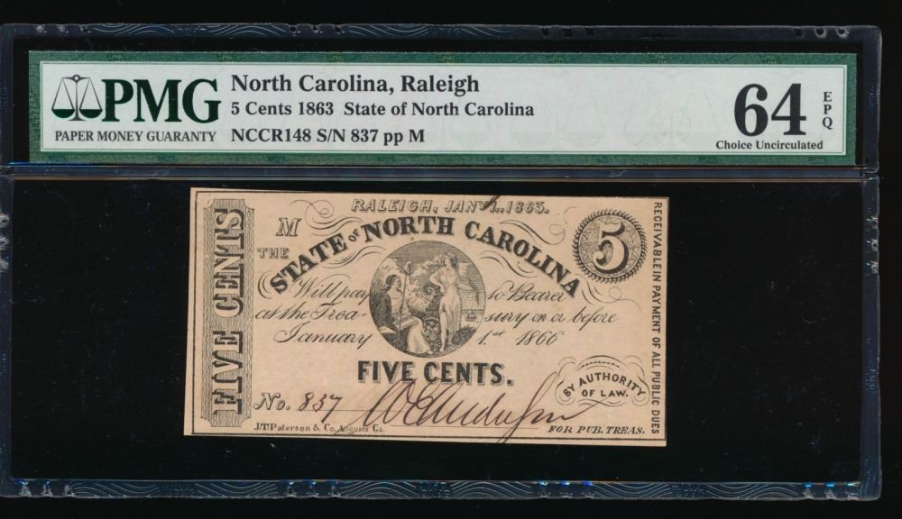 One 5 Cent 1863 Raleigh NC Obsolete Note PMG 64EPQ.