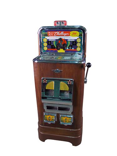 5 Cent 25 Cent Jennings Challenger Monte Carlo Slot Machine w/Double Jackpot. Has the 500 Bonus Coin jackpot. one for each denomination. This is the same feature which is on the Jennings Prospector which was made around the same time. w/keys