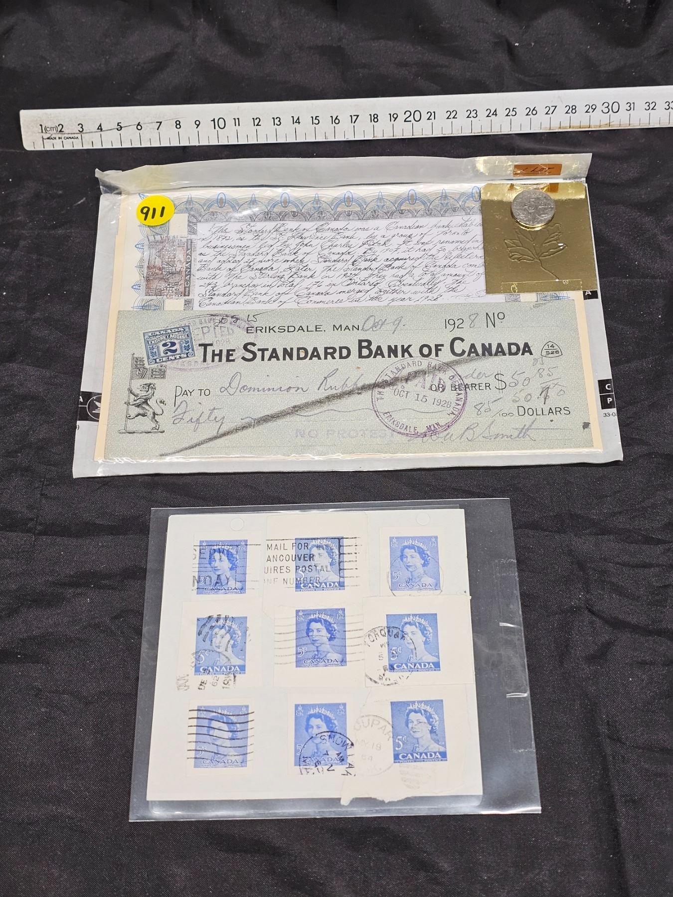 5 Cent Canada Stamps + 1927 5 Cent Coin + 1928 Cheque