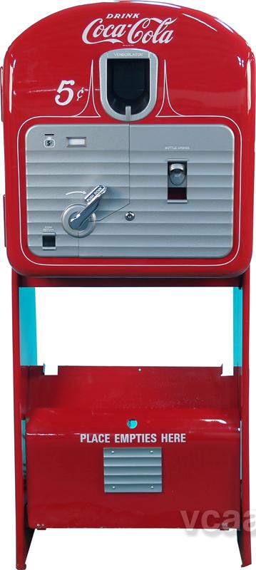 5 Cent Coca Cola Floor Model Vendo Model 27 Vending Machine, this model was referred to as the "Mailbox" w/ rare case holder base w/ keys. Comes w/ old wooden yellow Coca Cola case w/ 24 empty Coca Cola bottles.