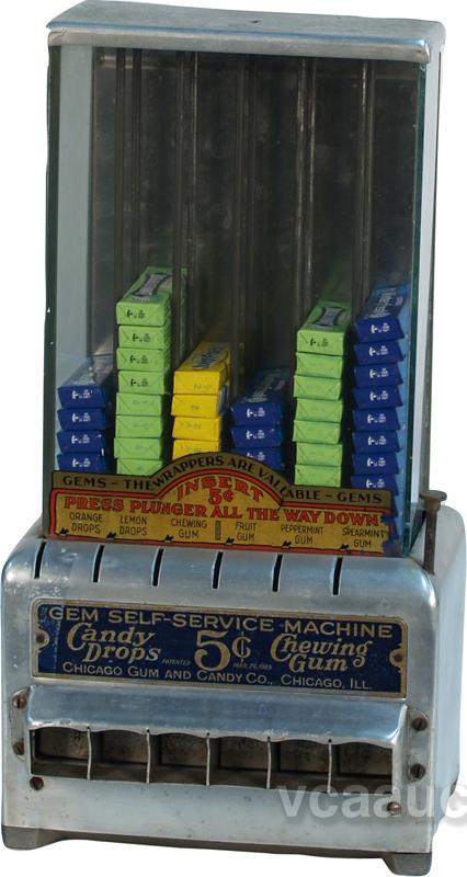 5 Cent Countertop Aluminum "Gem Self-Service Machine" 6-Column Vending Machine by Chicago Gum & Candy Co. c1920's w/ original label