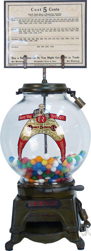 5 Cent Countertop Cast-Iron "E-Z" Gumball Vending Machine by Ad-Lee Novelty Co. pat. Sept. 15th, 1908 w/ original marquee, works w/ locks & keys