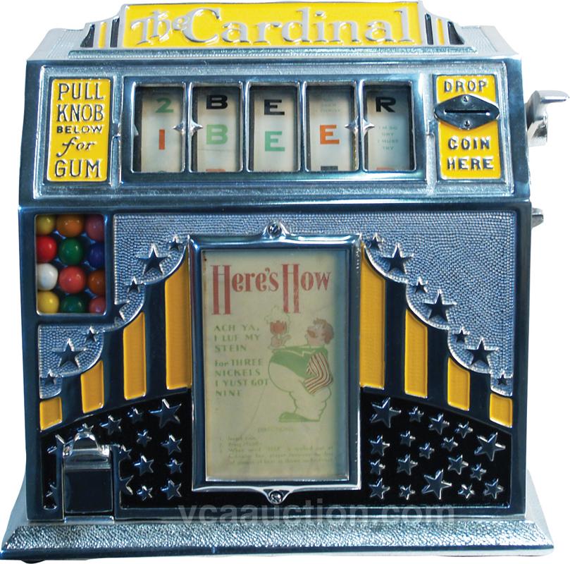 5 Cent Countertop "The Cardinal" 5-Reel Gumball Trade Stimulator c1935, spell out the word beer to win, restored w/ keys