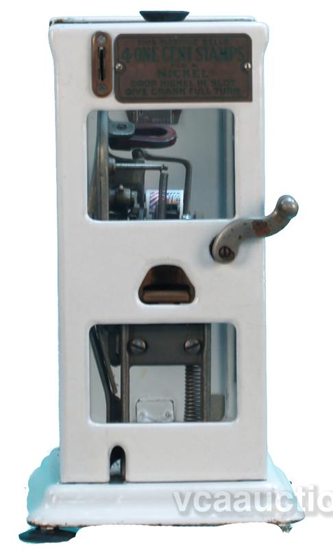 5 Cent Countertop White Porcelain Base & Sides w/ Glass Top & Sides US Postage Stamp Vending Machine Model 25 c1930 by Schermack Products Corp. w/ keys
