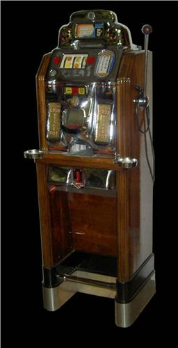 5 Cent Jennings Monte Carlo Prospector Slot Machine C.1946 Console Model, restored and has Automatic 1000 Coin Payout<BR><b>Due to laws regulating the sale of antique slot machines, I, as the seller, will not sell to members in the states of Alabama, Connecticut, Hawaii, Indiana, Nebraska, South Carolina, and Tennessee. Bids from members residing in any of these states will be cancelled.</b>