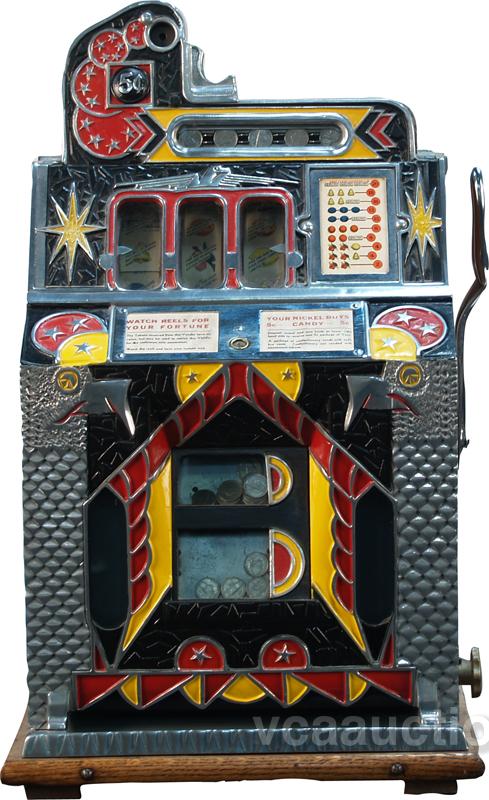 5 Cent Mills F.O.K. Mint Vendor Double Jackpot Slot Machine, stamped J.C. Co. on wood side panel w/ keys