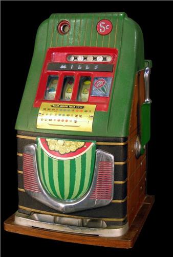 "Mills" "Watermelon" slot machine all original 5 Cent with factory locks and keys this is the way collectors strive to find slot machines<BR><b>Due to laws regulating the sale of antique slot machines, I, as the seller, will not sell to members in the states of Alabama, Connecticut, Hawaii, Indiana, Nebraska, South Carolina, and Tennessee. Bids from members residing in any of these states will be cancelled.</b>