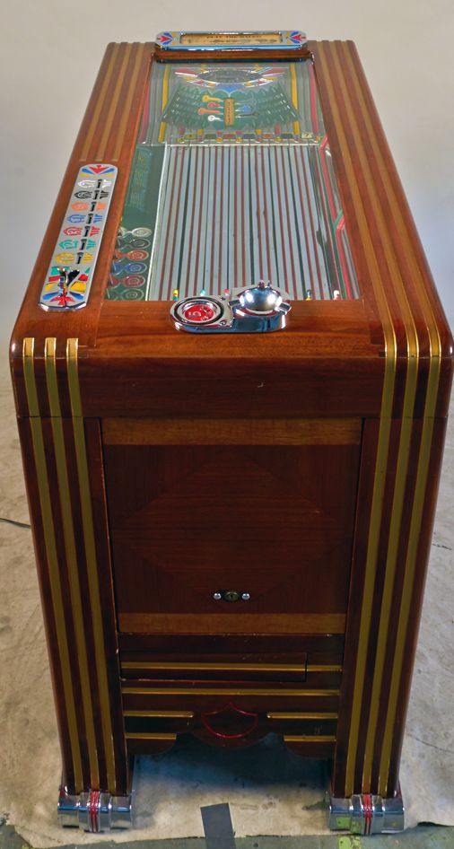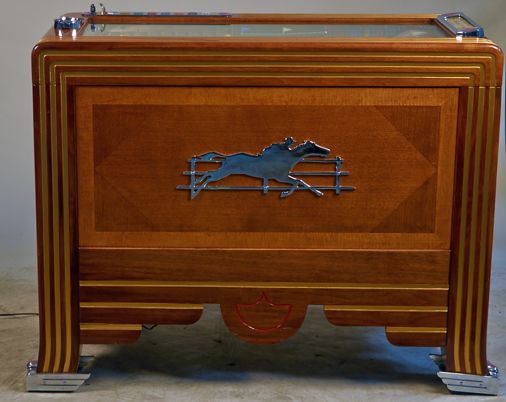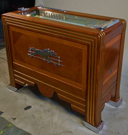 5 Cent Paces Races Horse Race Console Slot Machine by Pace MFG., Amusement only, Inlaid brown cabinet c1936, Excellent condition w/ key