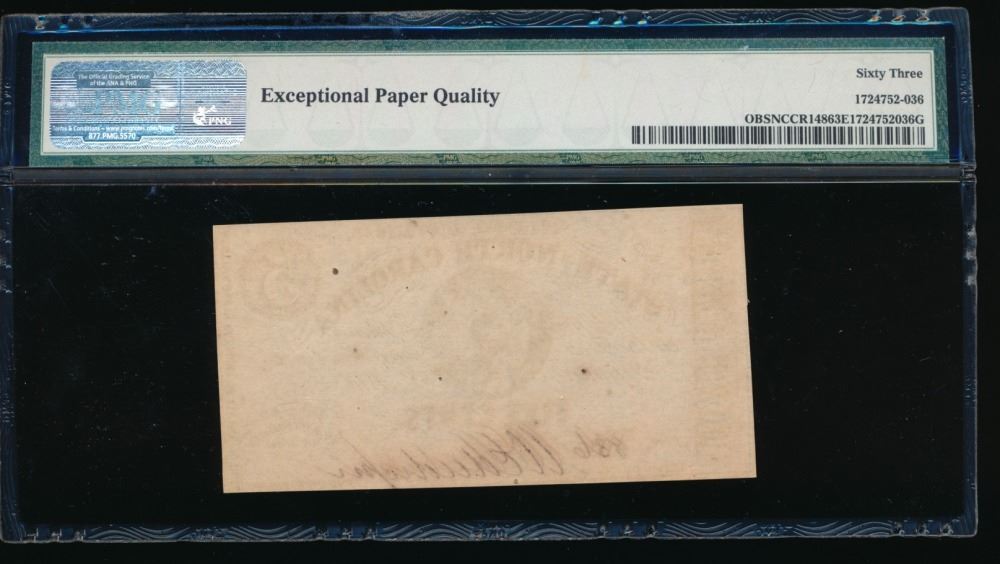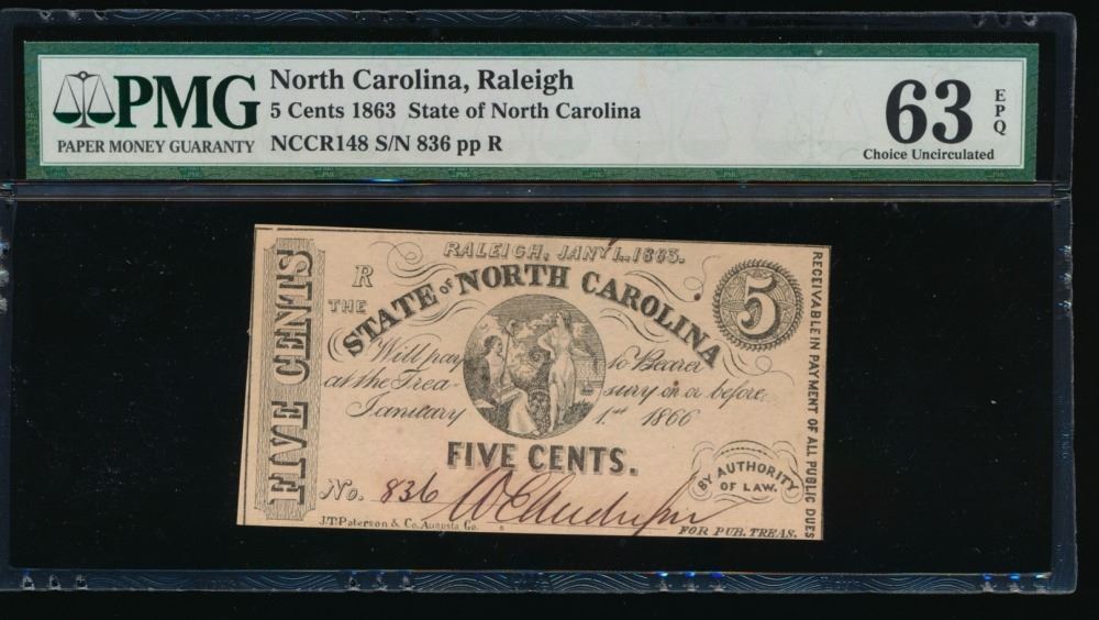 One 5 Cent Raleigh NC Obsolete Note PMG 63EPQ.