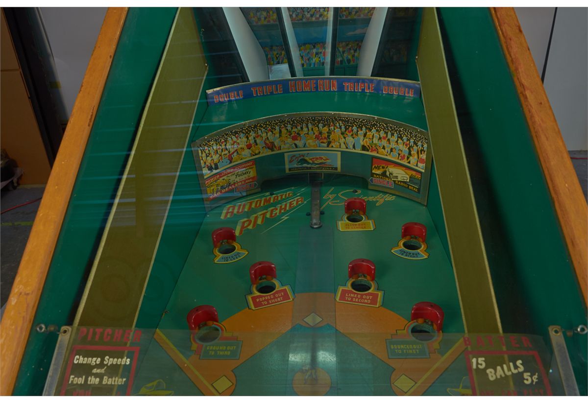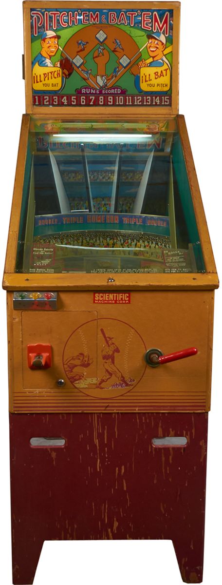 5 Cent Scientific Machine Corp. "Pitch 'Em & Bat 'Em" Automatic Pitcher Baseball Floor Arcade Machine c1948, Flipball style w/ manikin players, Backglass & playfield in excellent condition, Some wear to decals & paint on wood cabinet w/ keys