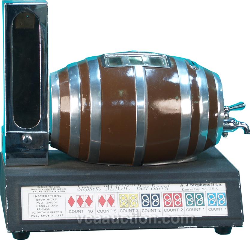 5 Cent Stephen's Magic Beer Barrel 3-Reel Trade Stimulator c1930's, in shape of barrel, fully restored no keys