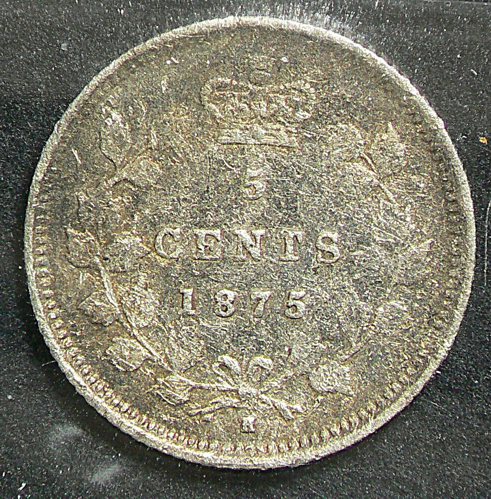 5 Cents 1875H, graded CCCS F-12; Small date, Corrosion, Damaged, Bent.