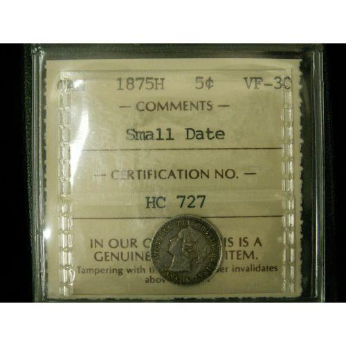5 Cents 1875H, graded ICCS VF-30; Small Date.