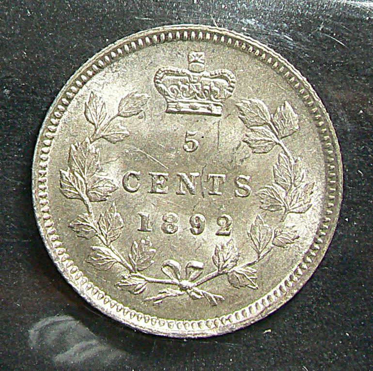 5 Cents 1892, graded ICCS MS-63; Obverse 2. Bright coin.