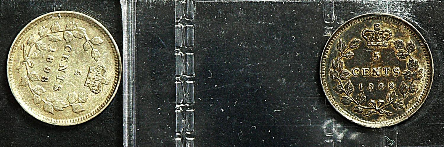 5 Cents 1893, graded ICCS EF-45 & 1899, graded ICCS EF-40. Lot of 2 coins.