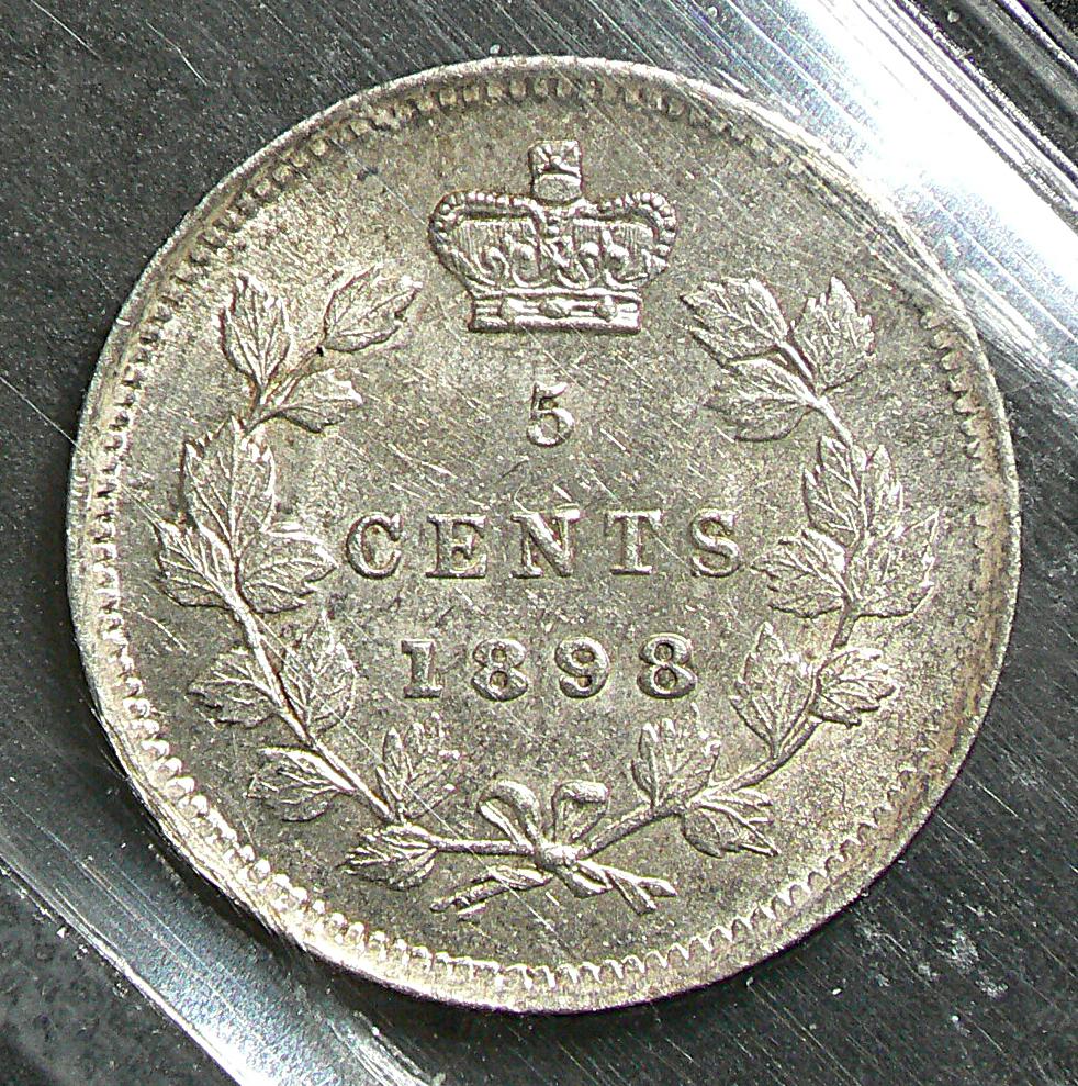 5 Cents 1898, graded ICCS AU-55. Light mauve toning.