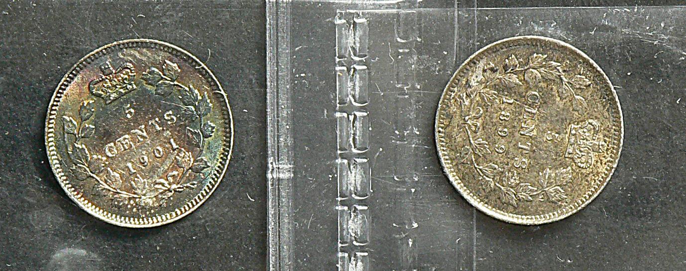 5 Cents 1899, graded ICCS EF-40 & 1901, graded ICCS AU-55. Lot of 2 coins.