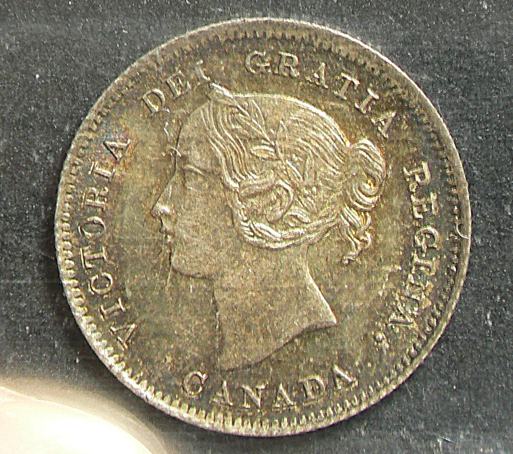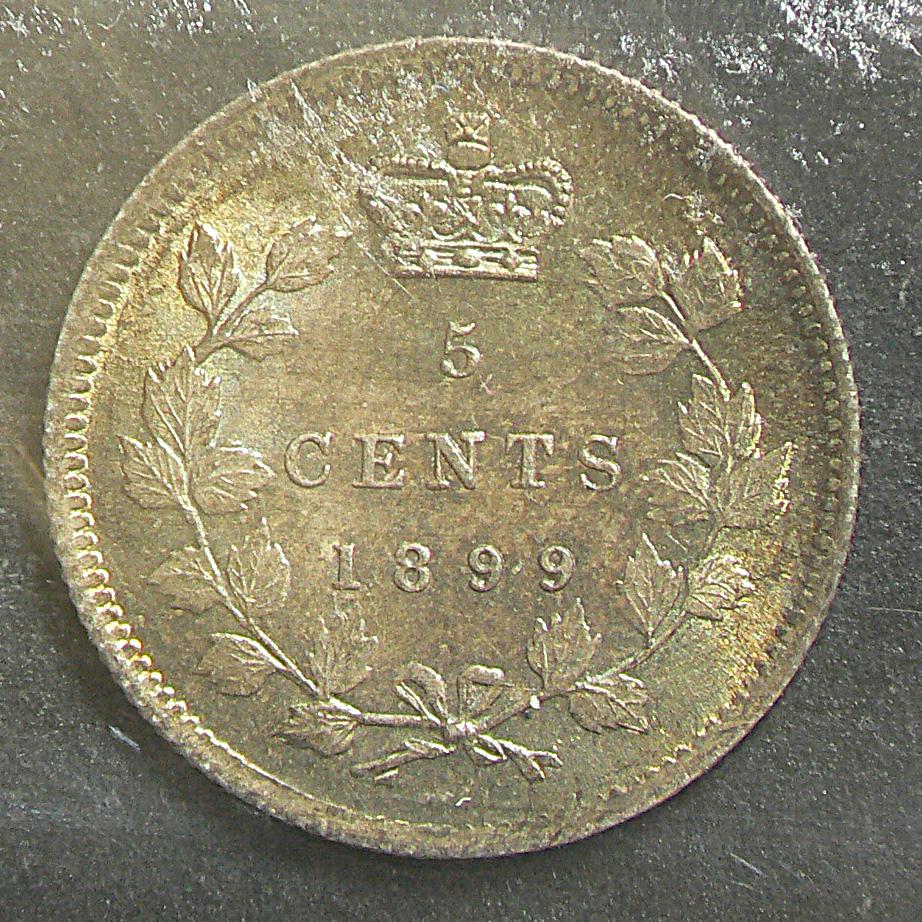 5 Cents 1899, graded ICCS MS-65. Very strong strike with rust color lustrous toning.