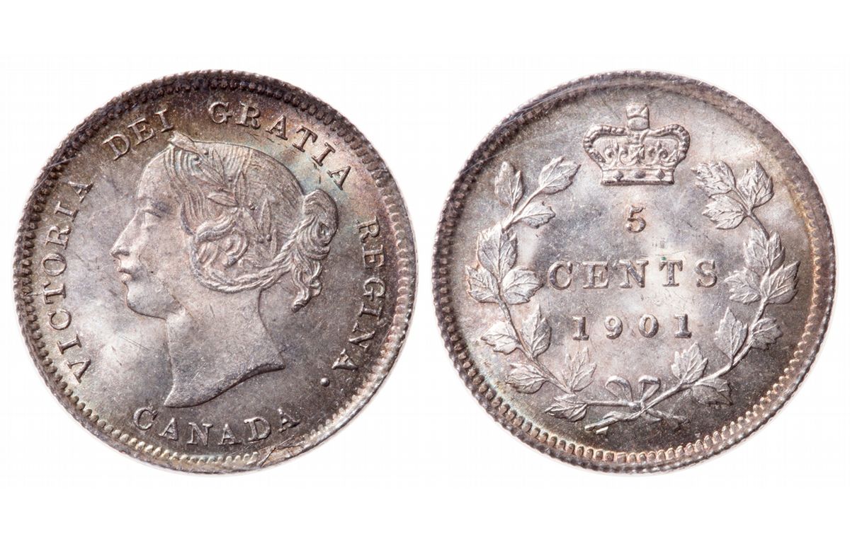 5 Cents. 1901. ICCS graded Gem Uncirculated-65. Marvellous toning in hues of bronze and blue-green. Well-struck, sharp and lustrous. Only 4 coins graded higher by ICCS in MS-66.