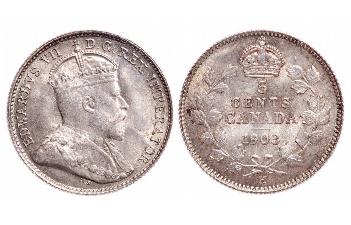 5 Cents. 1903-H. Small Repunched H. ICCS graded Gem Uncirculated-65. This unlisted variety of the Small H mintmark exhibits overall smoke-grey toning, excellent detail and good lustre. Of note is the clear doubling of the lower left serif of the H, which differs significantly from the Small H over H depicted in the Charlton Standard Catalogue. Only 4 small H coins of any variety have been graded by ICCS in MS-65 or higher.