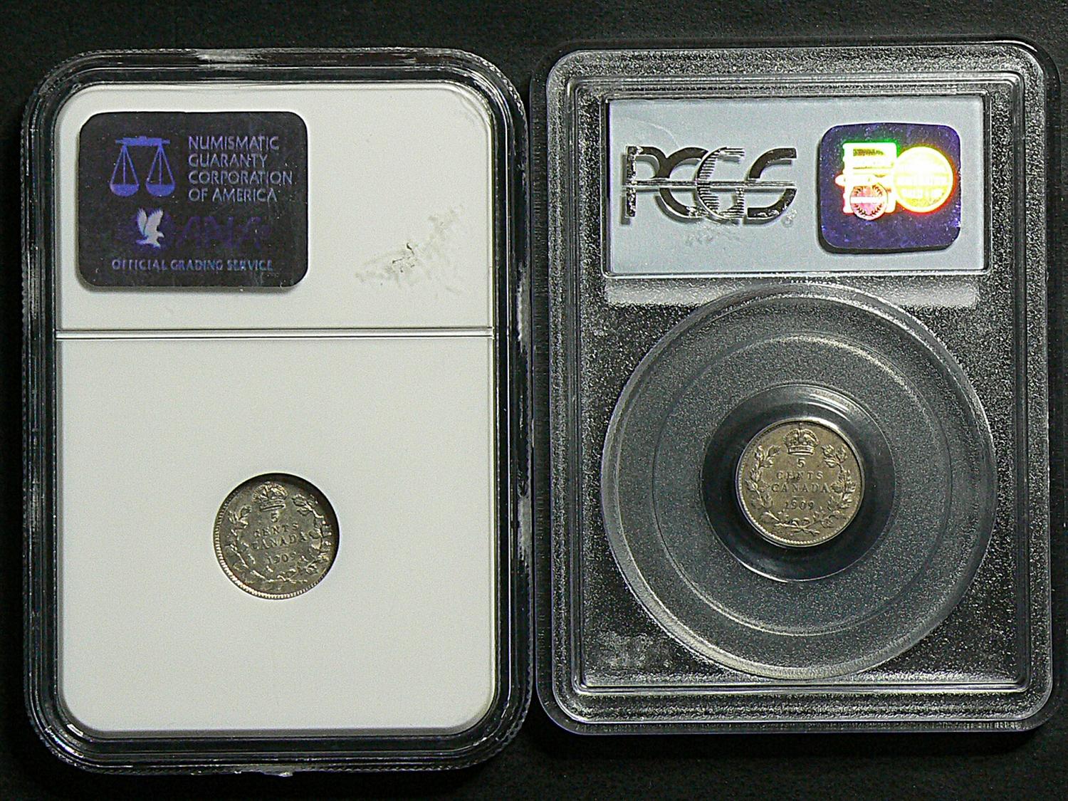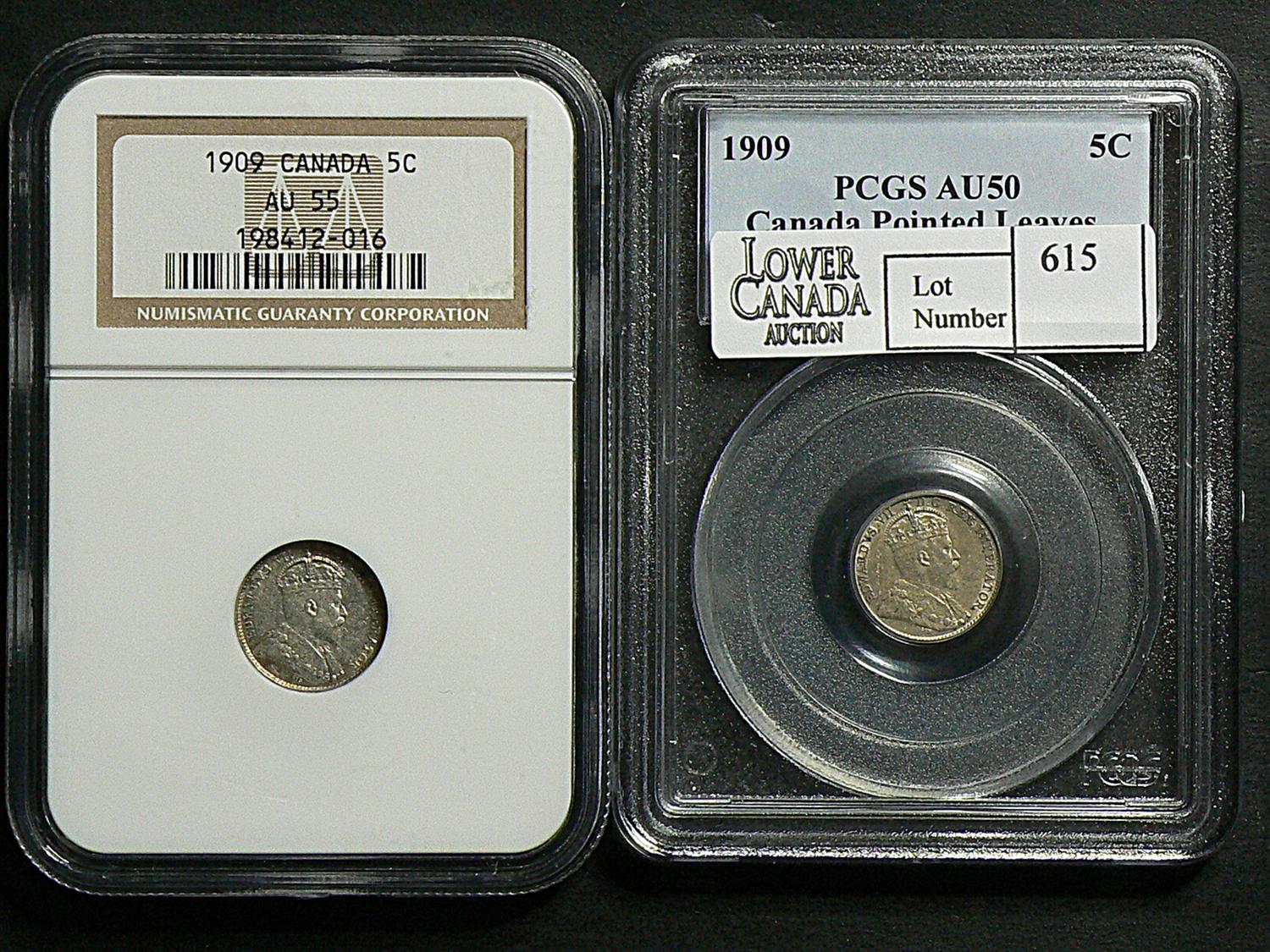 5 Cents 1909, graded NGC AU-55. Not noted Round Leaves, Bow Tie. 1909, graded PCGS AU-50; Pointed Leaf. Not noted is Maltese Cross Over Bow Tie. Lot of 2 coins.