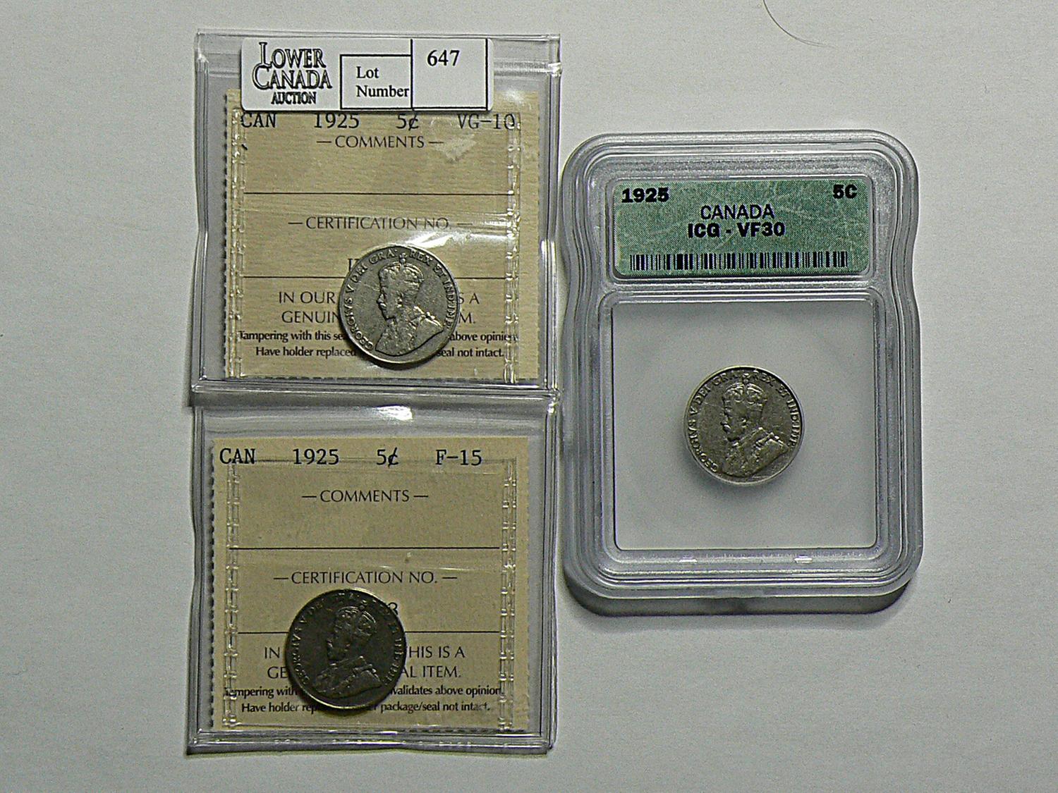 5 Cents 1925, graded ICCS, VG-10, F-15 & 1925 graded ICG VF 30. Lot of 3 coins