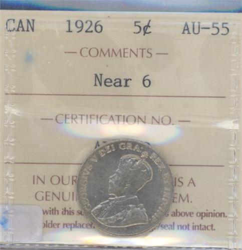 5 Cents 1926, ICCS certified AU-55; Near 6, always in demand in that grade and up.