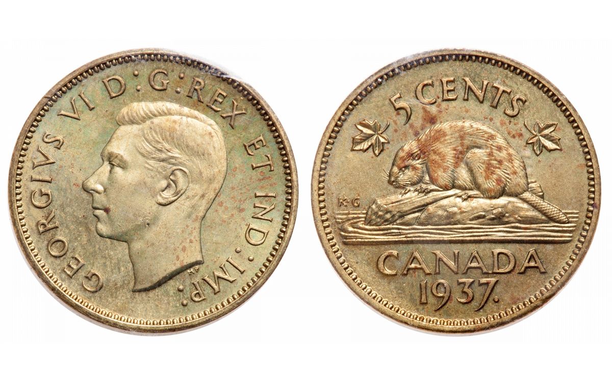 5 Cents. 1937 Dot. Brass Pattern, CH# DC-20. ICCS graded Specimen-64. Engraved and struck at the Paris Mint due to an excess of work at the Royal Mint, this brass specimen is a museum-worthy artifact of Canadian numismatic history. Of only three examples graded by ICCS, just one is finer in SP-66. PCGS lists 4 in SP-64, and a single example in SP-64 is graded by NGC. The patina is a greenish-gold, particular to these brass patterns, with some russet reverse spotting. The fields are mirror with a near-Cameo obverse bust. Coinage alignment, on a somewhat thick, 4.98g planchet. An outstanding rarity.