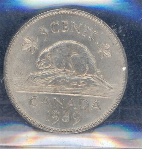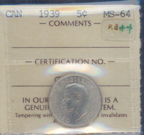 5 Cents 1939, ICCS certified MS-64. Hard to find a beauty like this.