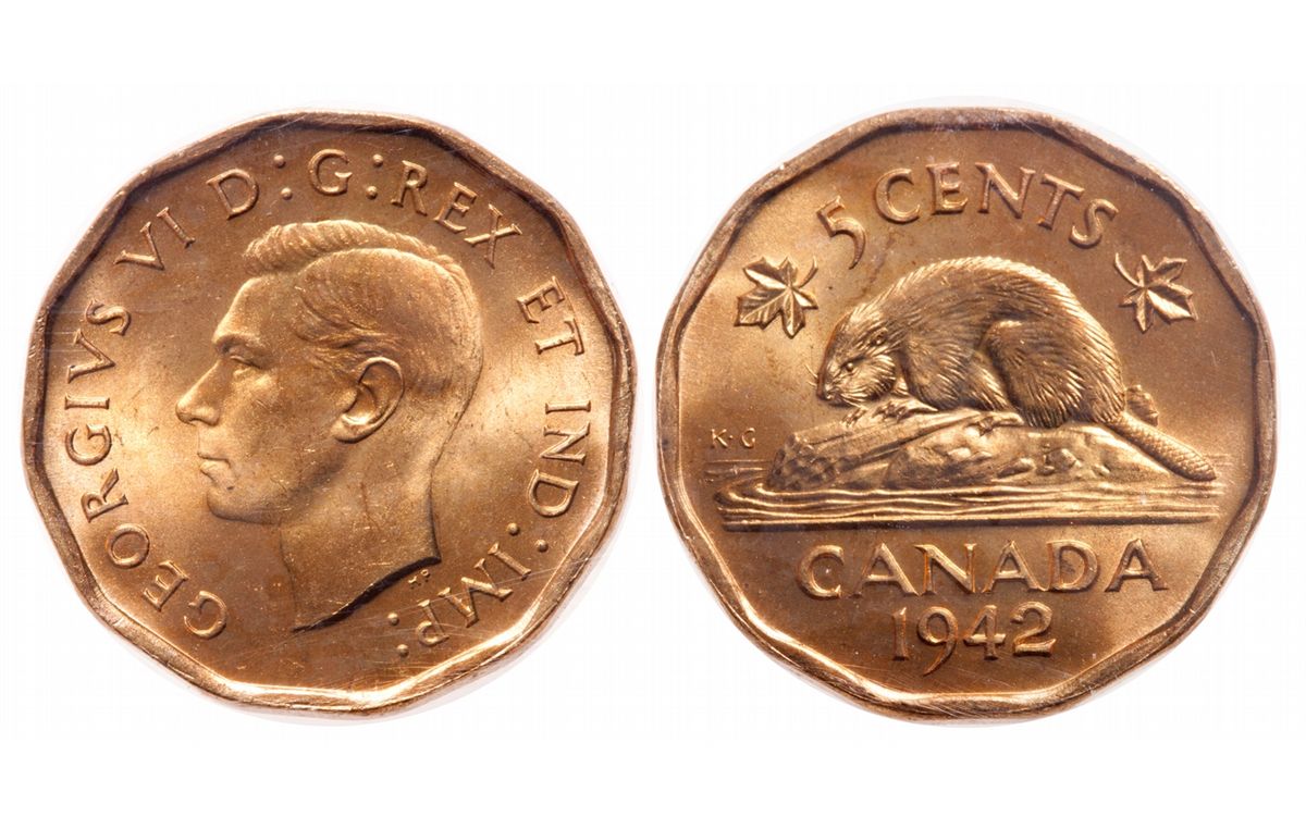 5 Cents. 1942. Tombac. ICCS graded Superb Gem Uncirculated-66. While nearly 1300 tombac 5 cents have been graded mint-state by ICCS, a mere 9 pieces have warranted an MS-66, and of those we have seen, this example is the finest. The lustre is bold and flashy, with full blazing amber-gold colour and excellent detail. None graded higher by ICCS.