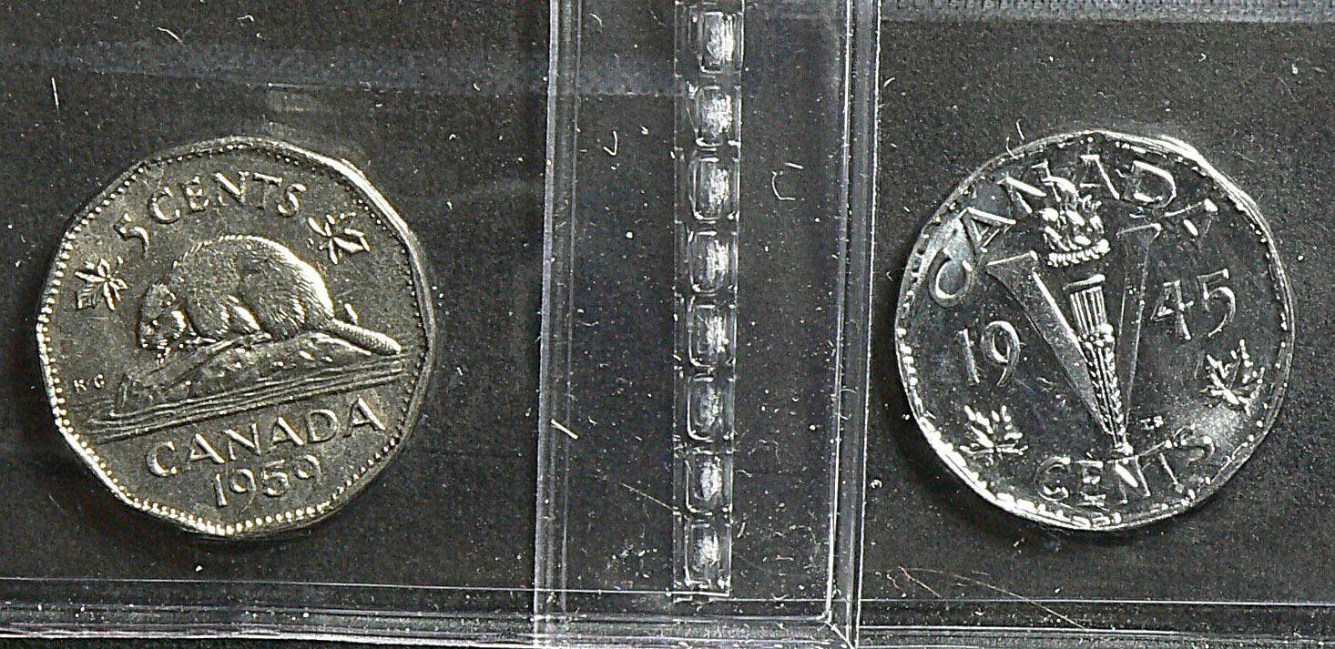 5 Cents 1945, graded ICCS MS-65, 1959, graded ICCS MS-65. Lot of 2 coins
