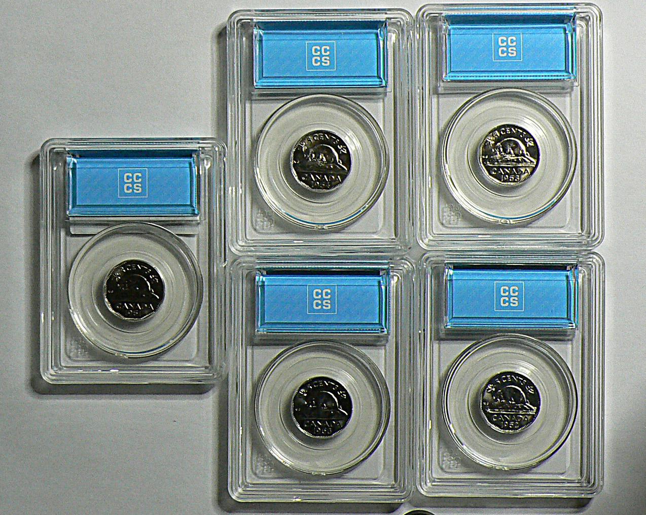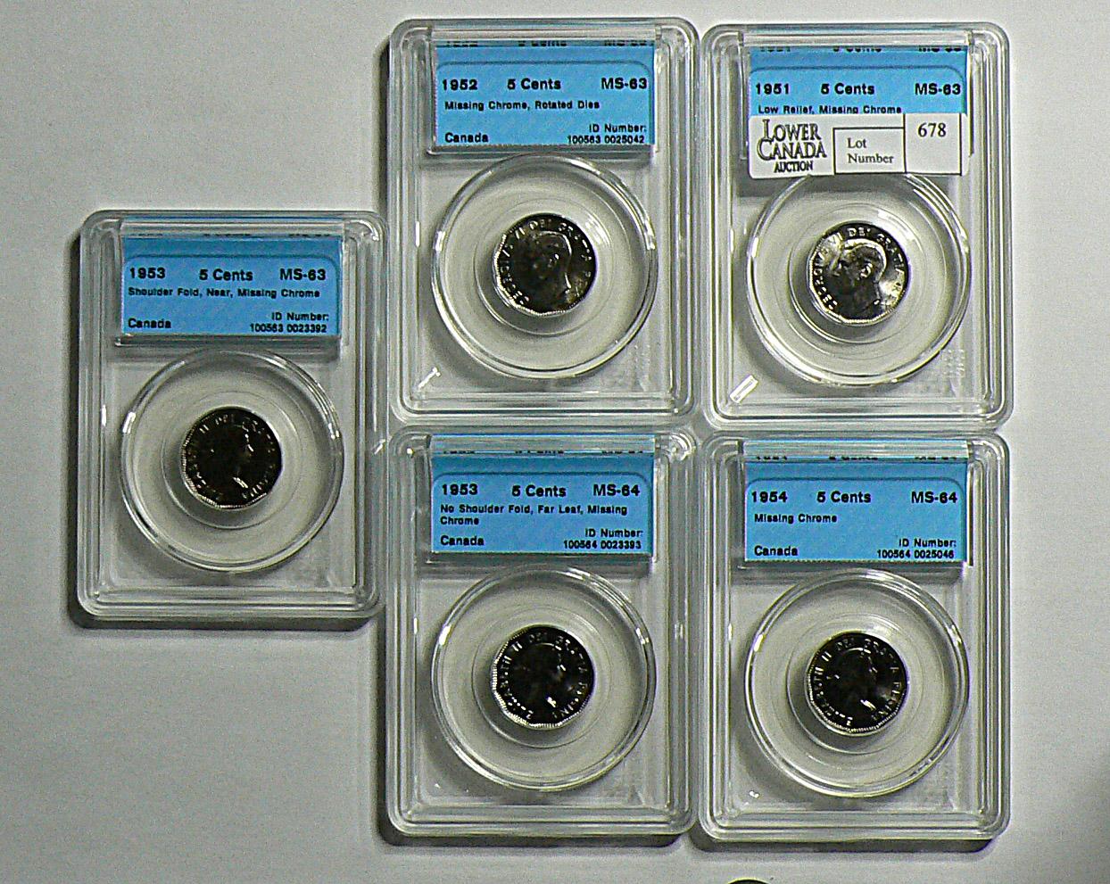 5 Cents 1951, graded CCCS MS-63; Low Relief, Missing Chrome, only 1 graded higher. 1952, graded CCCS MS-63; Missing Chrome, Rotated Dies, only 1 graded higher. 1953, graded CCCS MS-63; Shoulder Fold, Near Leaf, Missing Chrome, only 1 graded higher. 1953, graded CCCS MS-64; No Shoulder Fold, Far Leaf, Missing Chrome, only 2 graded higher. 1954, graded CCCS MS-64; Missing Chrome, only 1 graded higher. Lot of 5 coins, all in CCCS hard casing and the second nicest Missing Chrome Mint State set.