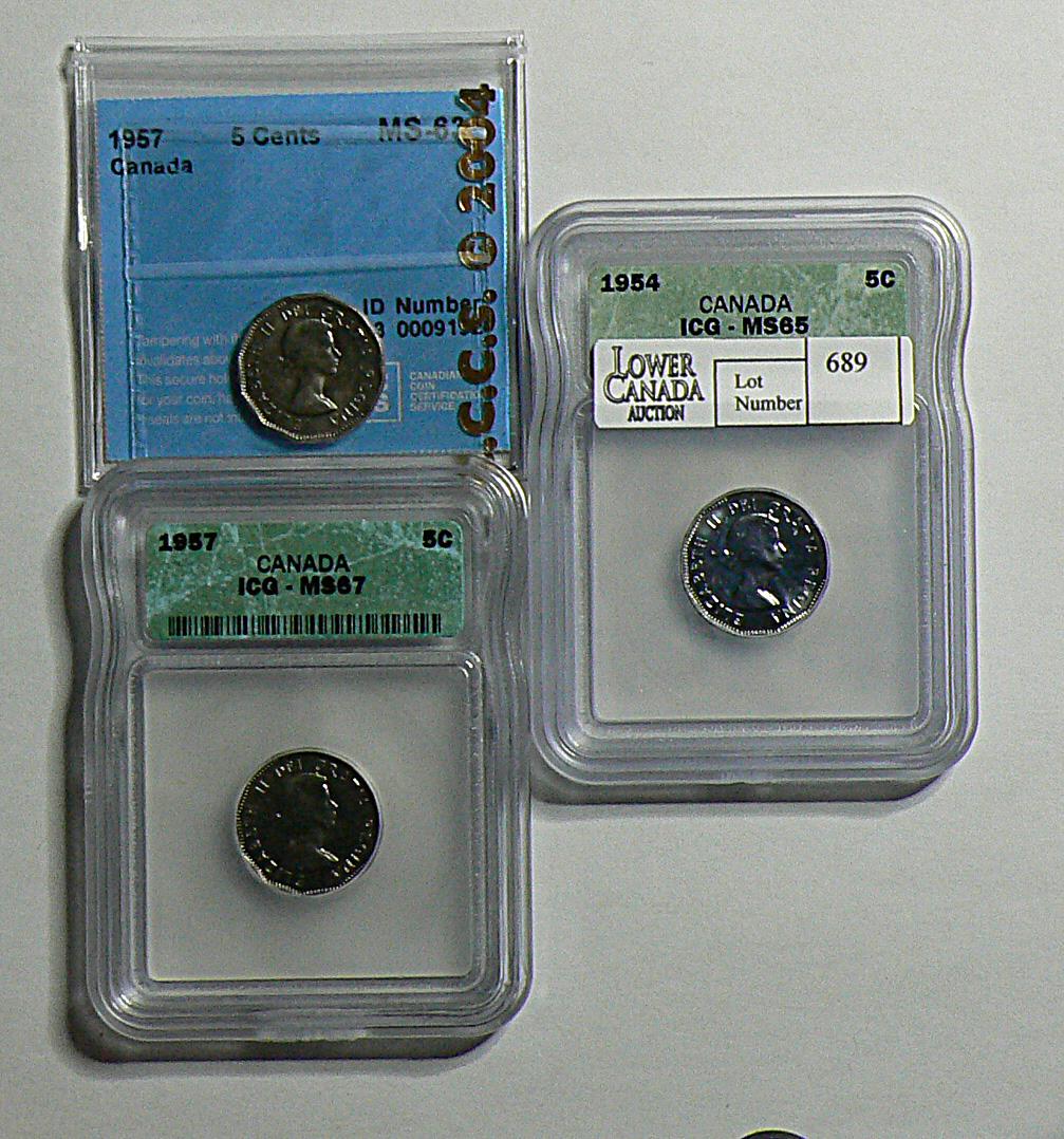 5 Cents 1954, graded ICG MS-65, 1957, graded ICG MS-67, 1957, graded CCCS, MS-63, lot of 3 coins