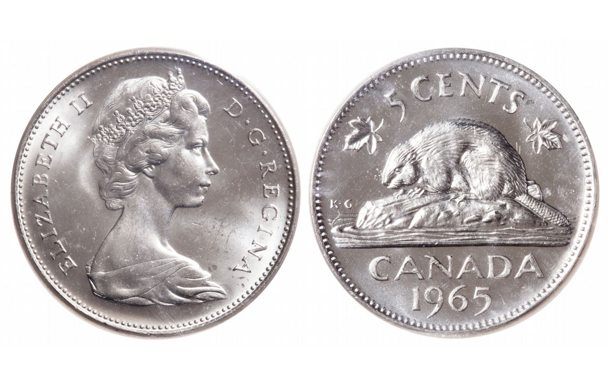 5 Cents. 1965. Large Beads, Detatched Jewel. ICCS graded Gem Uncirculated-65. Considered very scarce in any condition, this key variety is all but unheard of in gem mint state. The detatched jewel is clearly identifiable under magnification. This piece boasts a lustrous satin obverse and a Cameo reverse with mirror fields. This coin is the single finest example graded by ICCS. A superb rarity.