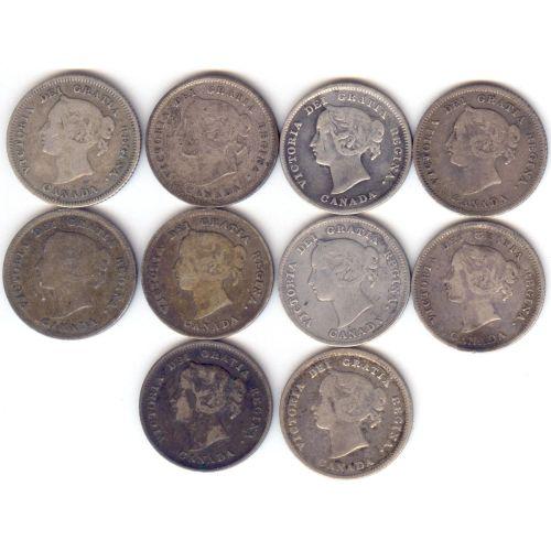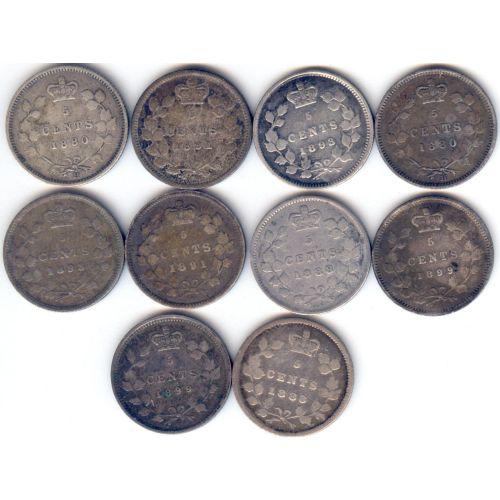5 Cents lot of 10 x Victoria; 1880H (2), 1888 (2), 1891 (2), 1893 (2), 1899 (2). Average VG-10