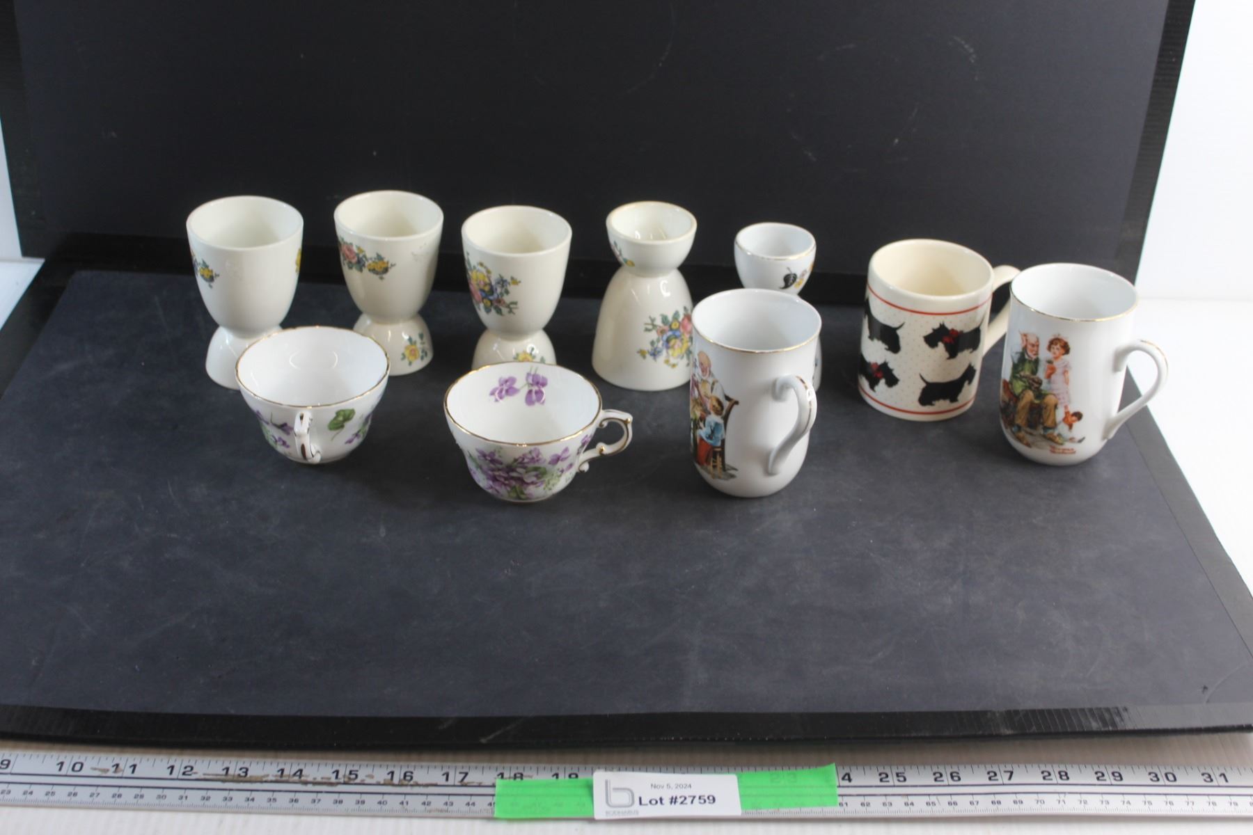 (5) Ceramic Egg Holders, (3) Mugs and (2) Tea Cups