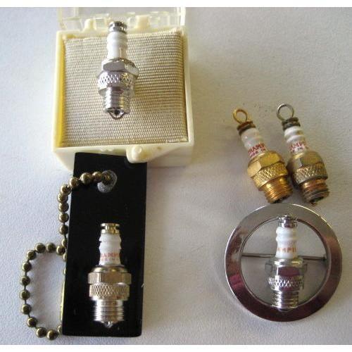 5 - Champion Spark Plug Advertising items Tie Tac, Pin, Key Chain, 2 - 1" plugs marked made in U.S.A.