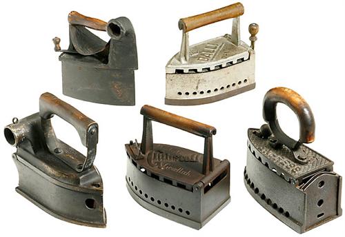 5 Charcoal Irons 1) "Deutsche Glühstoff Gesellschaft", length 8 in., very rare. - 2) Chimney iron "Mondragon UC", length 6 1/3 in. - 3) "Dalli", length 7 4/5 in. - 4) Hungarian iron "Patent Express", length 8 3/4 in. - And: 5) Hungarian chimney iron, marked "Patent Budapest Andrassy U 47", length 8 3/4 in.<Br>