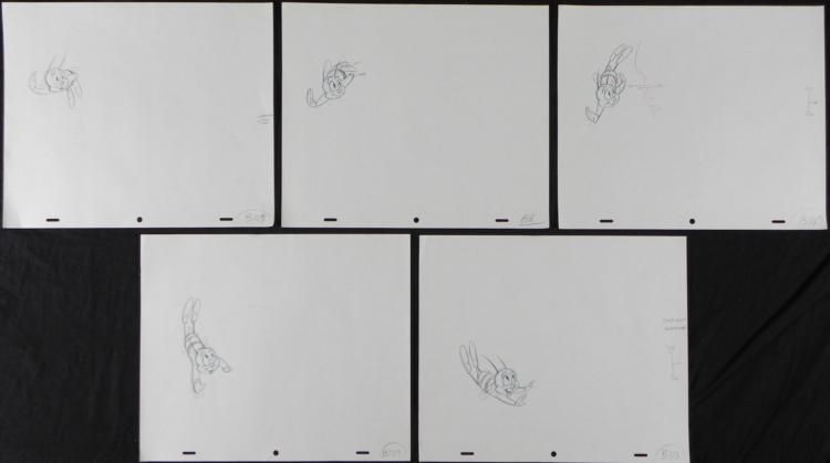Cheerio sir5 Original Animation DrawingsDetails: Animation notations and peg holesOriginal "rough" animation drawing, in black pencilSize of drawing: 10 1/2 x 12 1/2 inchesCondition: Very goodTraditional animation is a multi-step process which includes various types of art techniques. Drawings are a key part of the process, in which the animator creates the design and movement of the characters. Drawings are then transferred onto acetate cels. There are 5 different drawing of Buzz, the Cheerios bee.